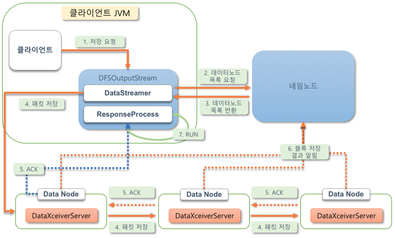 - DataStreamer 는 파이프라인의 첫 번째 데이터노드부터 패킷 전송을 시작하게 되며, 데이터노드는 클라이언트와 다른 데이터노드로 부터 패킷을 주고 받기 위해 DataXceiverServer 데몬을 실행한다. DataXceiverServer는 클라이언트 및 다른 데이터노드와 패킷 교환 기능 제공한다. 첫 번째 데이터노드는 패킷을 저장하면서, 두 번째 데이터노드에게 패킷 저장을 요청한다. 두 번째 데이터노드도 패킷을 저장하면서, 세 번째 데이터노드에게 패킷 저장을 요청한다. 마지막으로 세 번째 데이터노드가 패킷을 저장한다. 또한 첫 번째 데이터노드에 패킷을 저장할 때 DFSOutputStream 은 내부 큐인 승인큐(askQueue) 에 패킷을 등록 하고 승인큐는 패킷 전송이 완료됐다는 응답을 기다리는 패킷이 등록돼 있으며, 모든 데이터노드로 부터 응답을 받았을 때만 해당 패킷이 제거된다.
