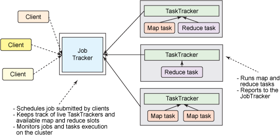 사용자가 새로운 Job을 요청하면 JobTracker는 Job을 어떻게 처리할 것인지 계획을(Map과 Reduce를 몇개를 실행할지, 어떤 TaskTracker에 할당할 것이지) 세우고, 이를 수행한다. 이후 JobTracker와 TaskTracker는 하트비트라는 메서드로 네트워크 통신을 하면서 TaskTracker의 상태와 작업 실행 정보를 주고받게 된다. 만약 TaskTracker에 문제가 발생하면 다른 대기 중인 TaskTracker를 찾아 태스크를 재실행한다.